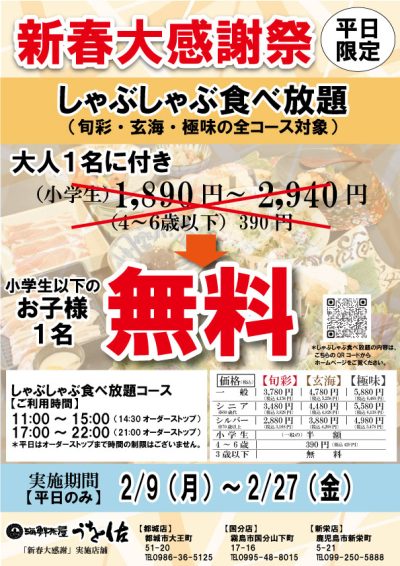 前回、大好評だった小学生以下のお子様しゃぶしゃぶ食べ放題無料キャンペーン開催! 今回は、都城店、国分店、新栄店 3店舗限定での開催となります!